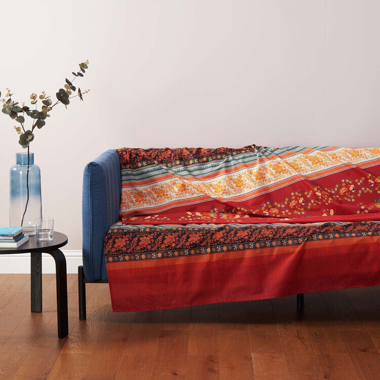 Telo d'arredo multiuso in puro cotone con stampa indanthrene per mantenere i colori inalterati nel tempo.
