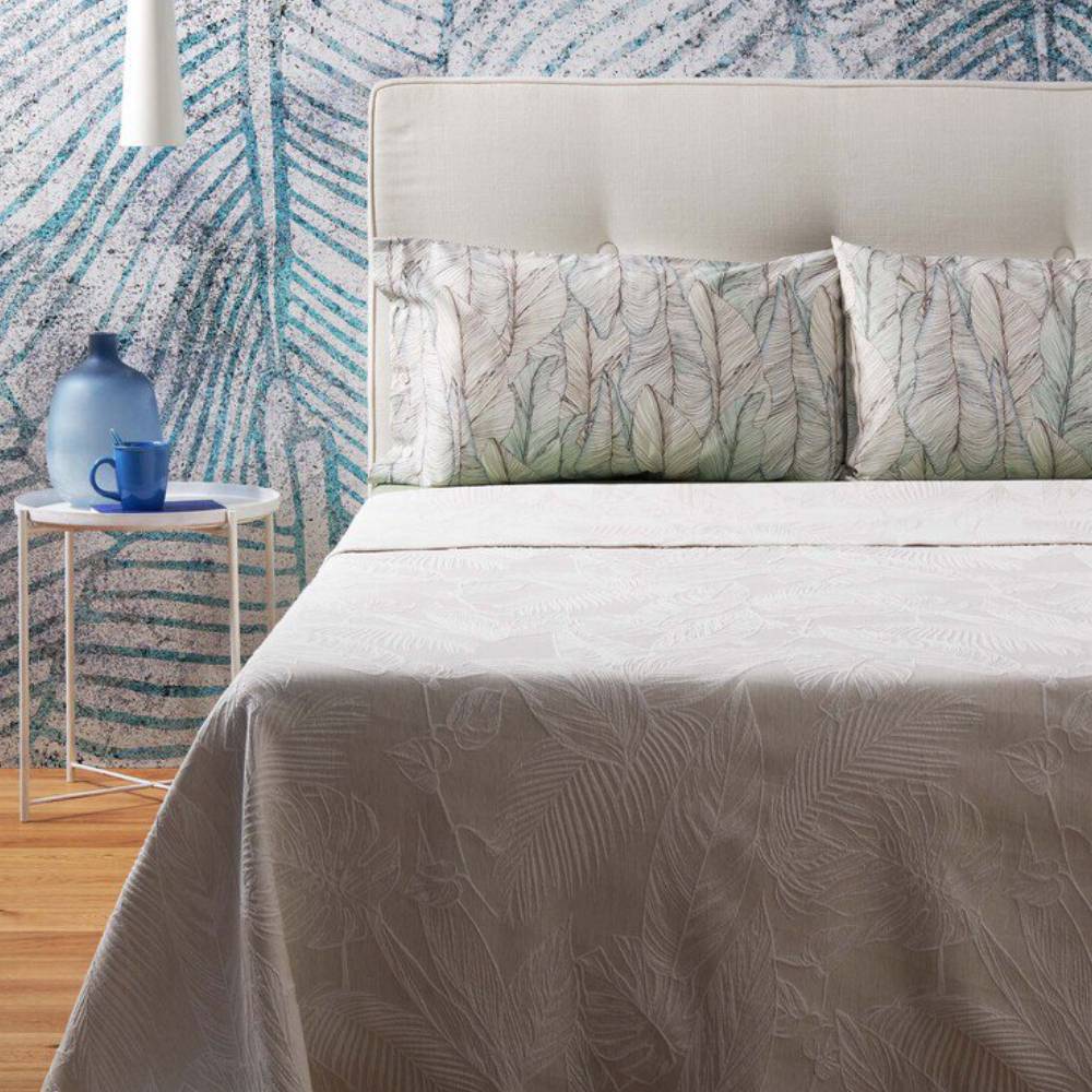 Copriletto jacquard tinto filo Madeira della collezione Zucchi. Copriletto dal fondo color naturale e un disegno con un importante foliage all over con effetto tridimensionale.
