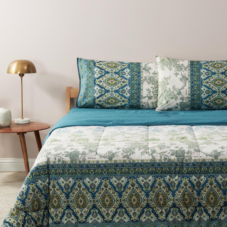 Il lenzuolo sopra è impreziosito dalla stampa a vista sia sul piano del letto che sulla balza per essere utilizzato anche senza copriletto.