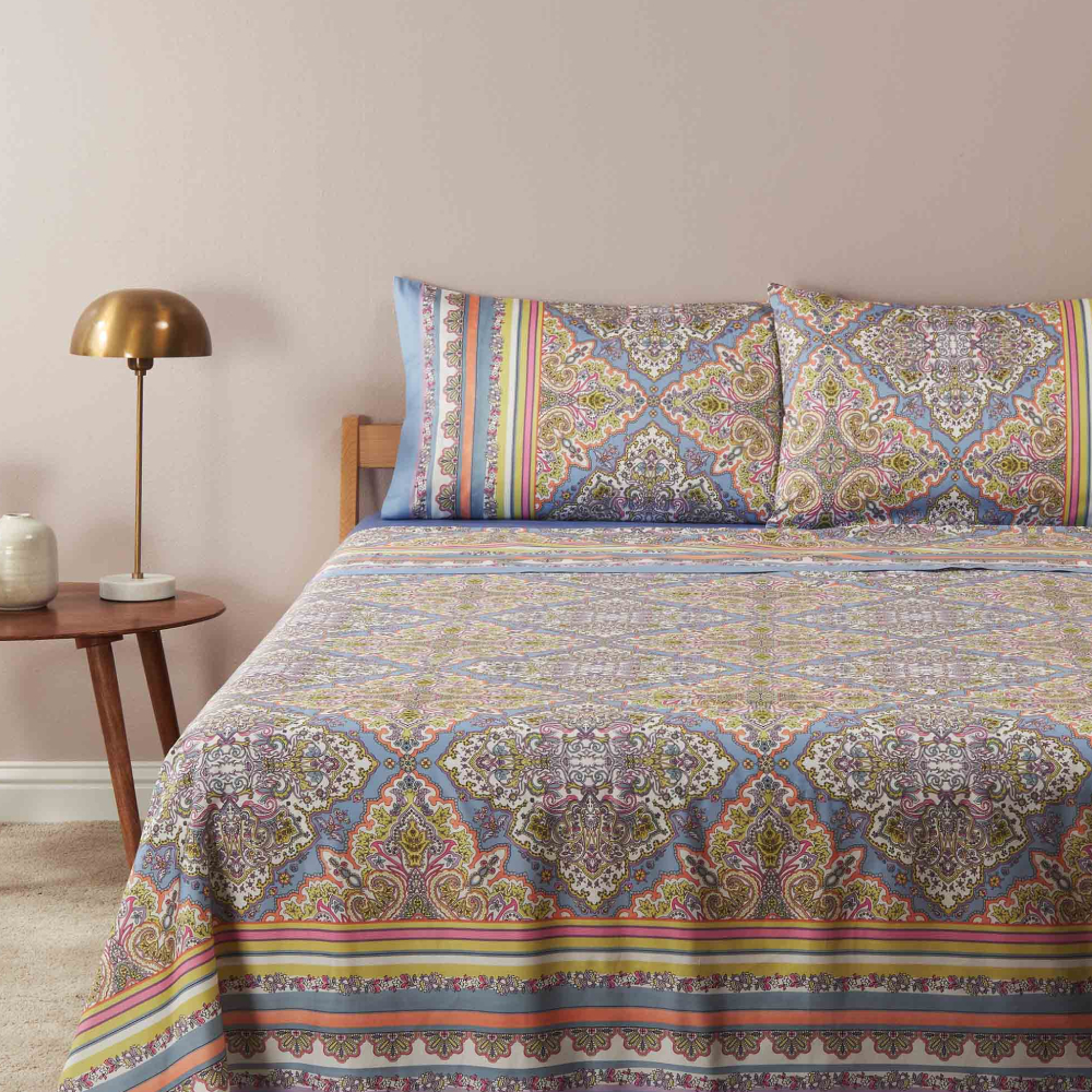 Il lenzuolo sopra è impreziosito dalla stampa a vista sia sul piano del letto che sulla balza per essere utilizzato anche senza copriletto.