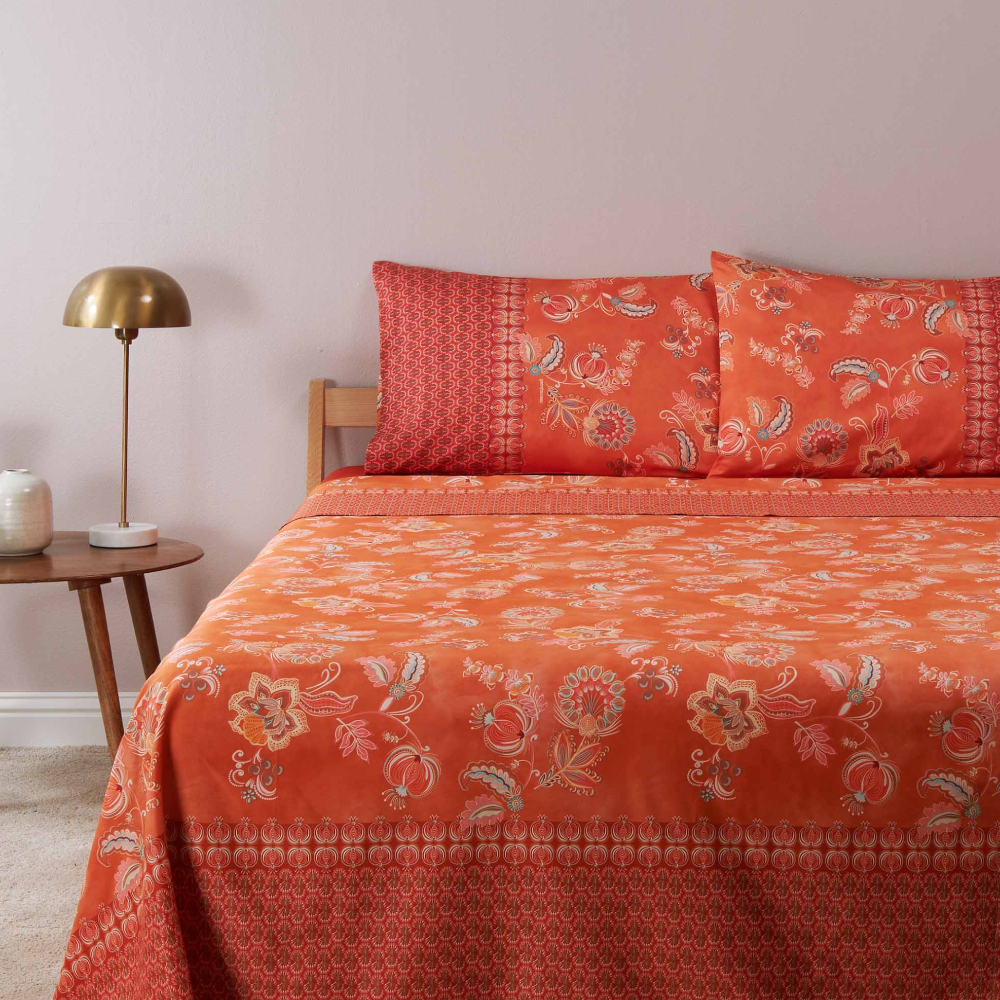 Il lenzuolo sopra è impreziosito dalla stampa a vista sia sul piano del letto che sulla balza per essere utilizzato anche senza copriletto.