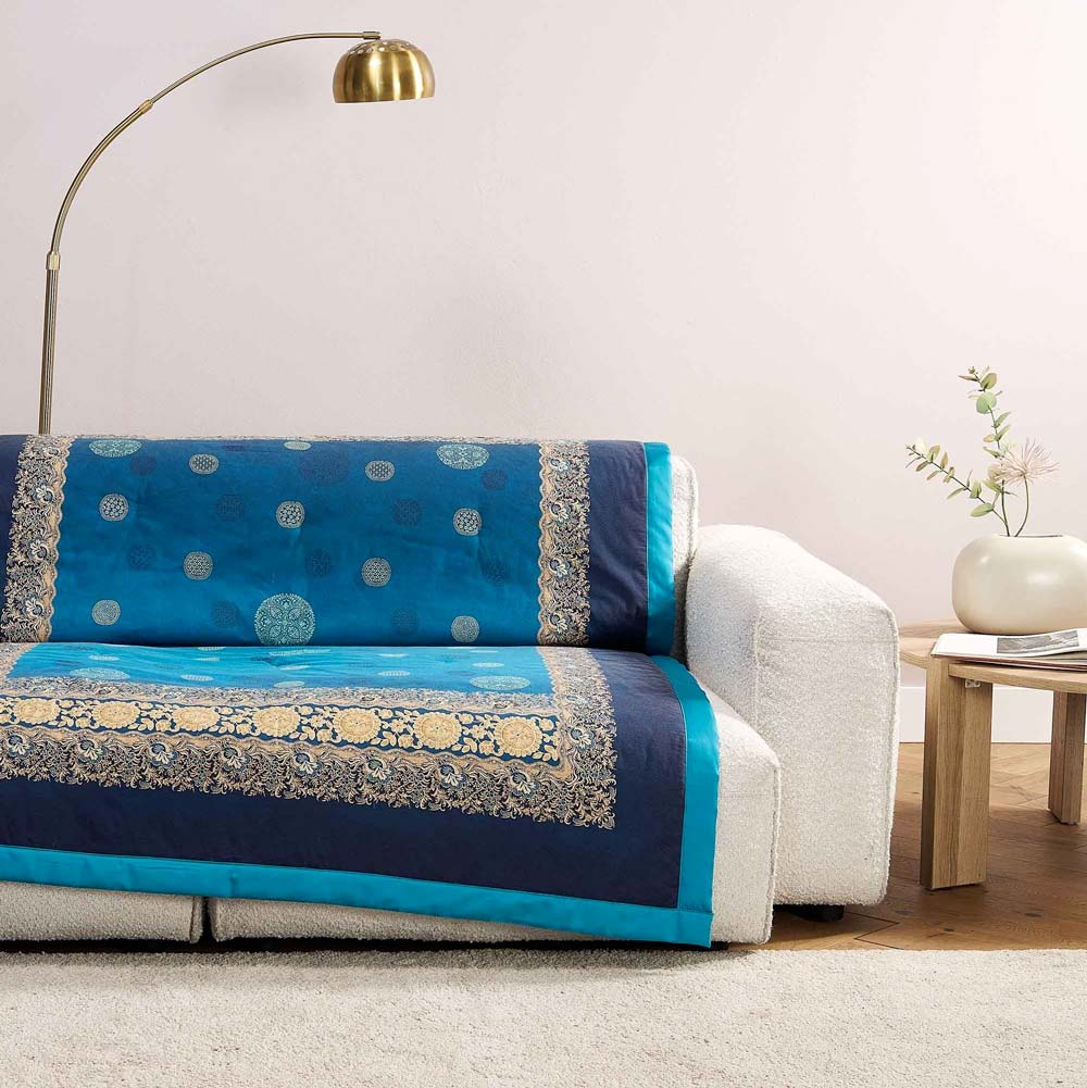 Il Plaid Bassetti Pallavicino B1 presenta un design eccezionale ispirato alla bellezza floreale. Gli sfondi colorati, che sfumano dal turchese al blu, sottolineano l'eleganza del motivo sofisticato. L'orlo decorato con ricami floreali e motivi geometrici circolari in stile greco aggiunge un tocco di classe a questo plaid multifunzionale.