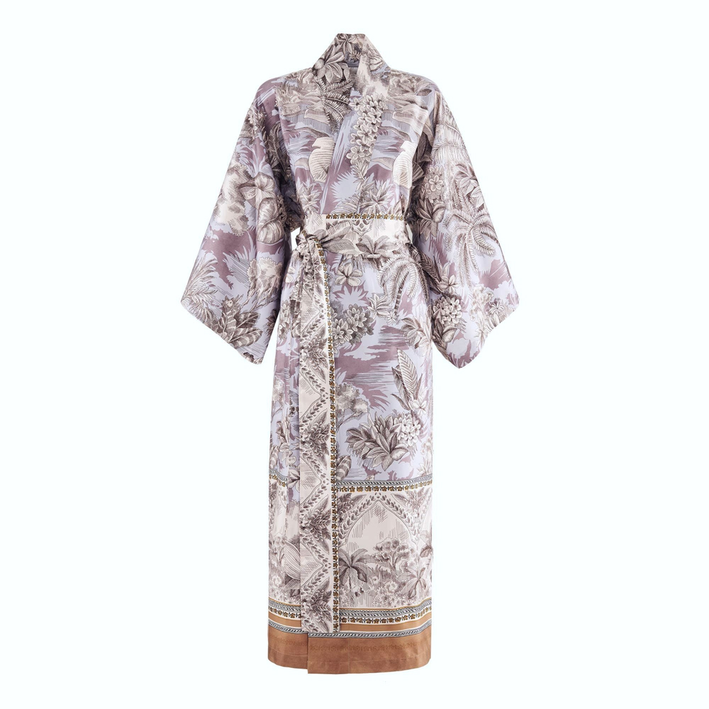 Realizzato in 100% cotone satin makò con una densità di 110 fili per cm², il Kimono è morbido, leggero e resistente. Il tessuto è prelavato per garantire comfort e durata nel tempo. Le delicate sfumature di grigio glacé e cammello creano un’atmosfera rilassante, portando pace e serenità nei tuoi momenti di relax.