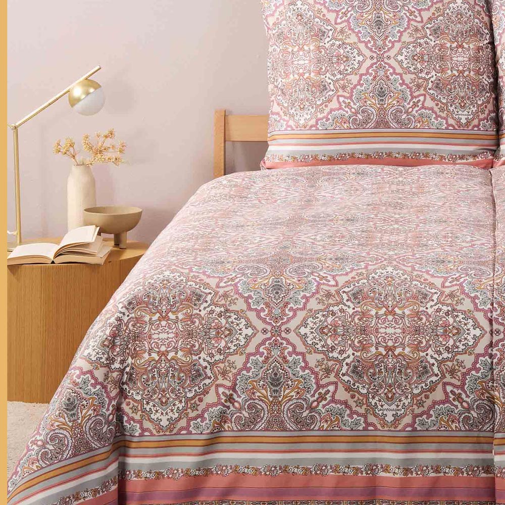 Con i copripiumini matrimoniali Bassetti, la qualità del tessuto si unisce all'eleganza del design. Il disegno raffinato presenta elementi decorativi in motivo paisley outline, messi in risalto da fasce colorate e bordure effetto ricamo.