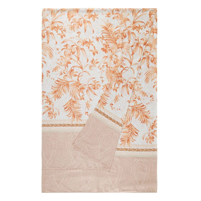 Il Telo Arredo Bassetti Ibiscus Tattoo 41 porta in casa un’atmosfera tropicale, fresca e rilassante. Ispirato a un giardino esotico, il disegno presenta fiori di ibisco acquerellati in delicate tonalità crema, albicocca e caramello, con sovrapposizioni che richiamano lo stile tattoo in chiave moderna. Un raffinato motivo paisley, appena accennato in trasparenza, dona profondità e originalità al tessuto.