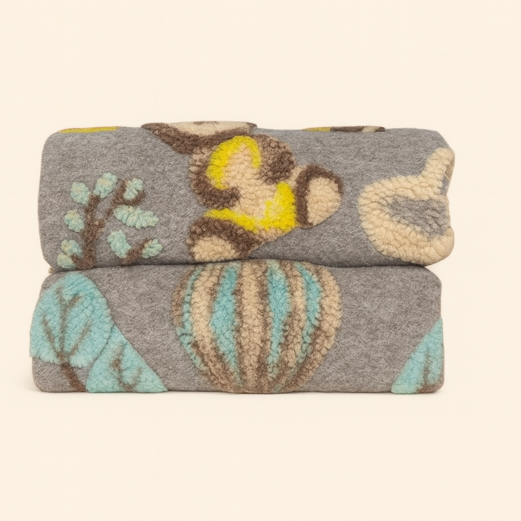 Coperta Artigianale in lana cotta Made in Italy 150x170 cm, con originale motivo di mongolfiere e bordo punto cavallo. Un accessorio caldo, traspirante e resistente, perfetto per valorizzare il tuo salotto o per creare un angolo lettura accogliente.