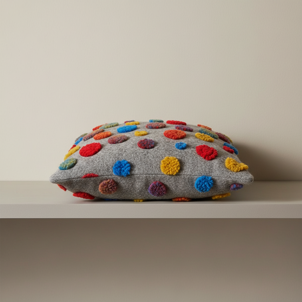 I pois colorati in rilievo emergono sul fondo grigio creando un effetto decorativo equilibrato, mai eccessivo. Un cuscino che si integra facilmente sia in ambienti moderni sia in case dallo stile creativo e familiare.