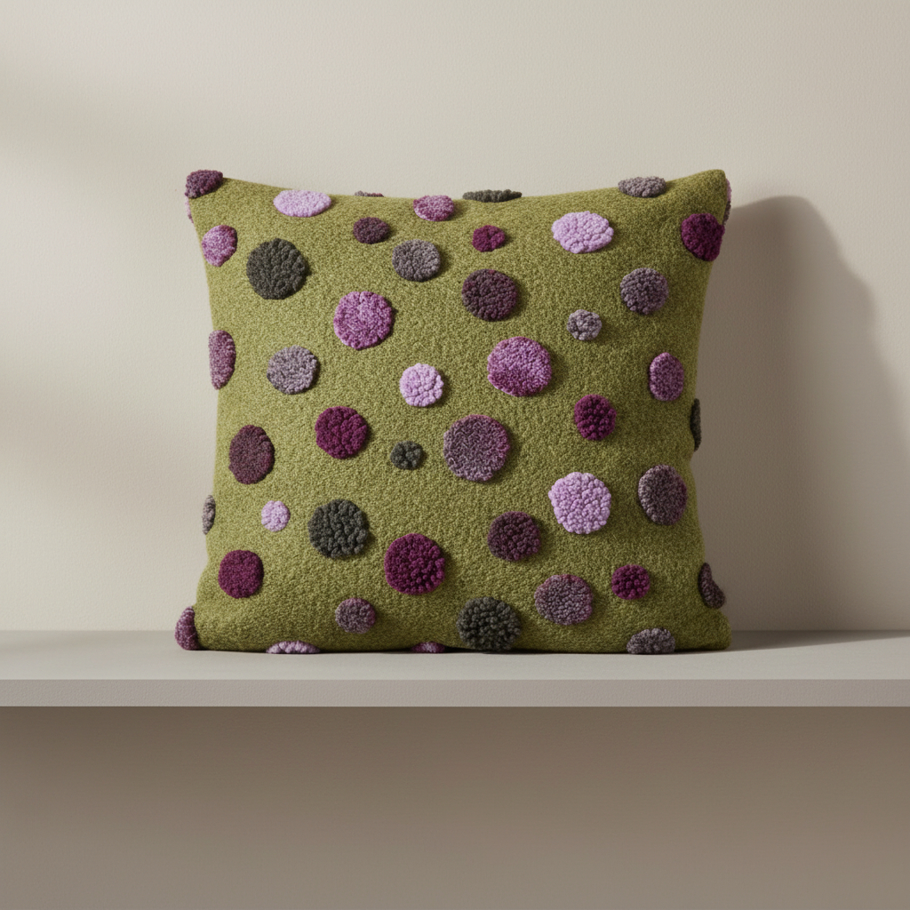 I pois colorati in rilievo donano profondità e movimento alla superficie del cuscino, valorizzando la texture della lana cotta. È una fantasia ideale per chi ama un arredo caldo e originale, perfetta per salotti accoglienti, ambienti creativi o case che vogliono distinguersi con piccoli dettagli di carattere.