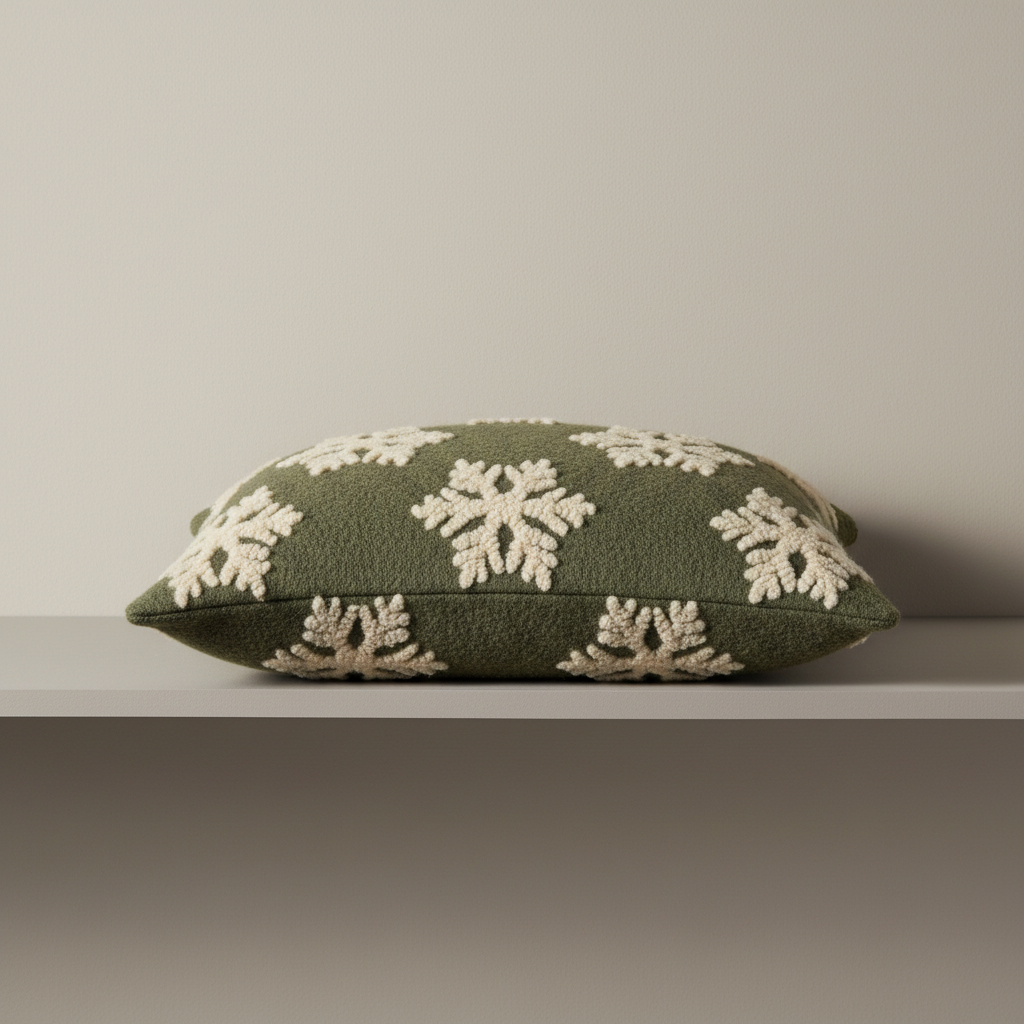 Il colore verde intenso crea una base elegante e naturale, impreziosita da fiocchi di neve chiari in rilievo. La texture leggermente materica del tessuto dona profondità visiva, mentre il motivo decorativo risulta armonioso e ben definito. Nell’immagine il cuscino è ambientato su una poltrona chiara, creando un contrasto raffinato e molto accogliente.