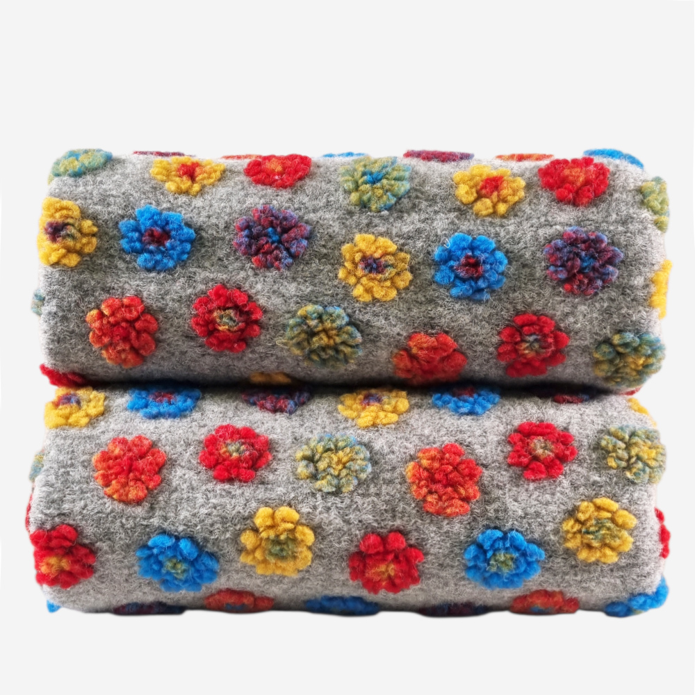 Il tocco di calore e delicatezza che stavi cercando per le tue serate sul divano! Questo plaid unisce la tradizione e il calore della lana cotta alla modernità e all'allegria del design di margherite multicolori.