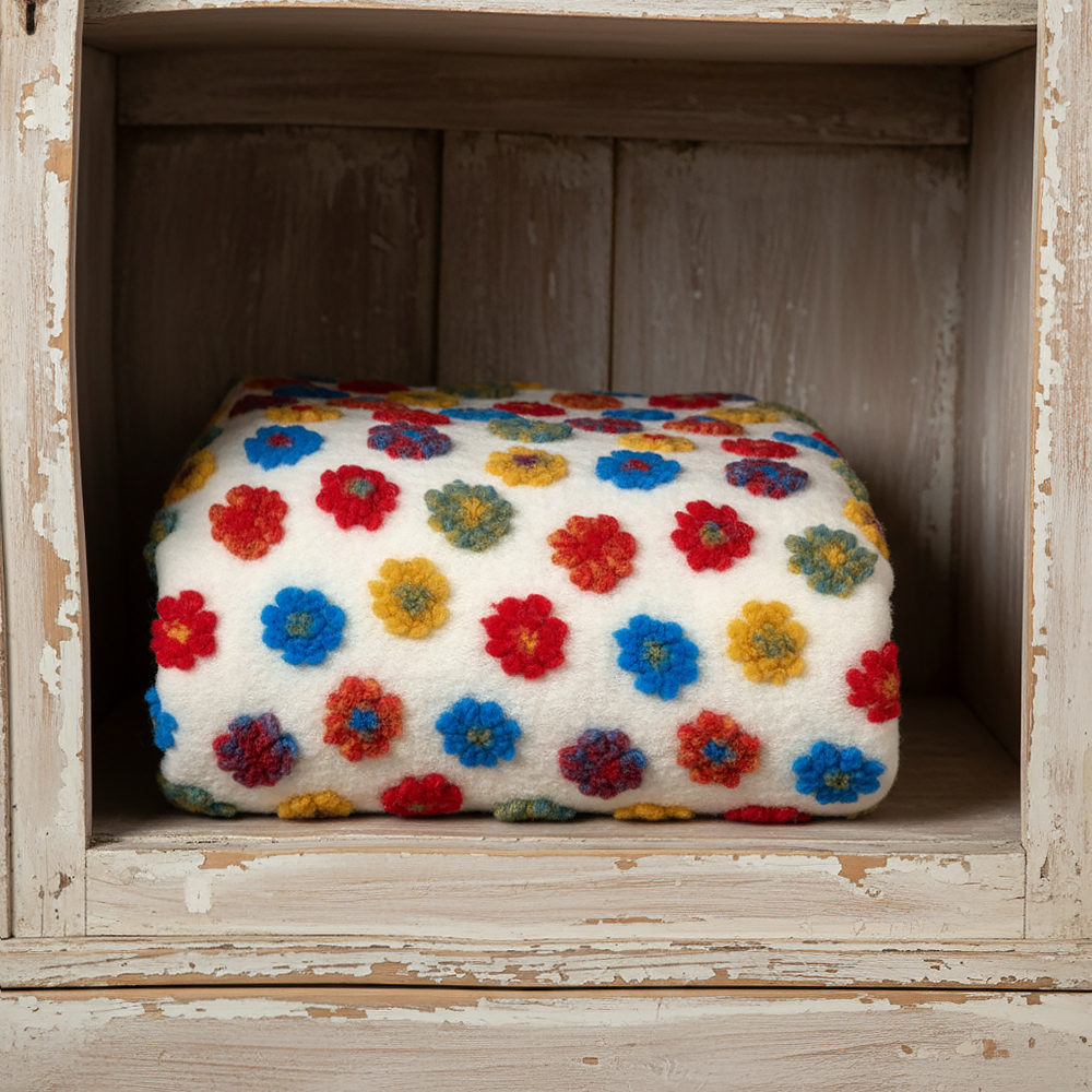 Il tocco di calore e delicatezza che stavi cercando per le tue serate sul divano! Questo plaid unisce la tradizione e il calore della lana cotta alla modernità e all'allegria del design di margherite multicolori.